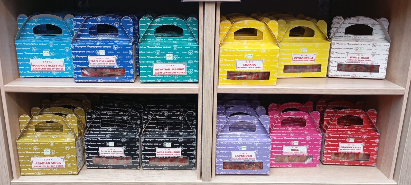 Aura cleansing, Black champa, Arabian musk, Egyptian jasmine, Buddha's blessing, Nag champa, Blue sage, Citronella, Chakra, White musk, Sandalwood, Dragon's fire, Lavender, Rose