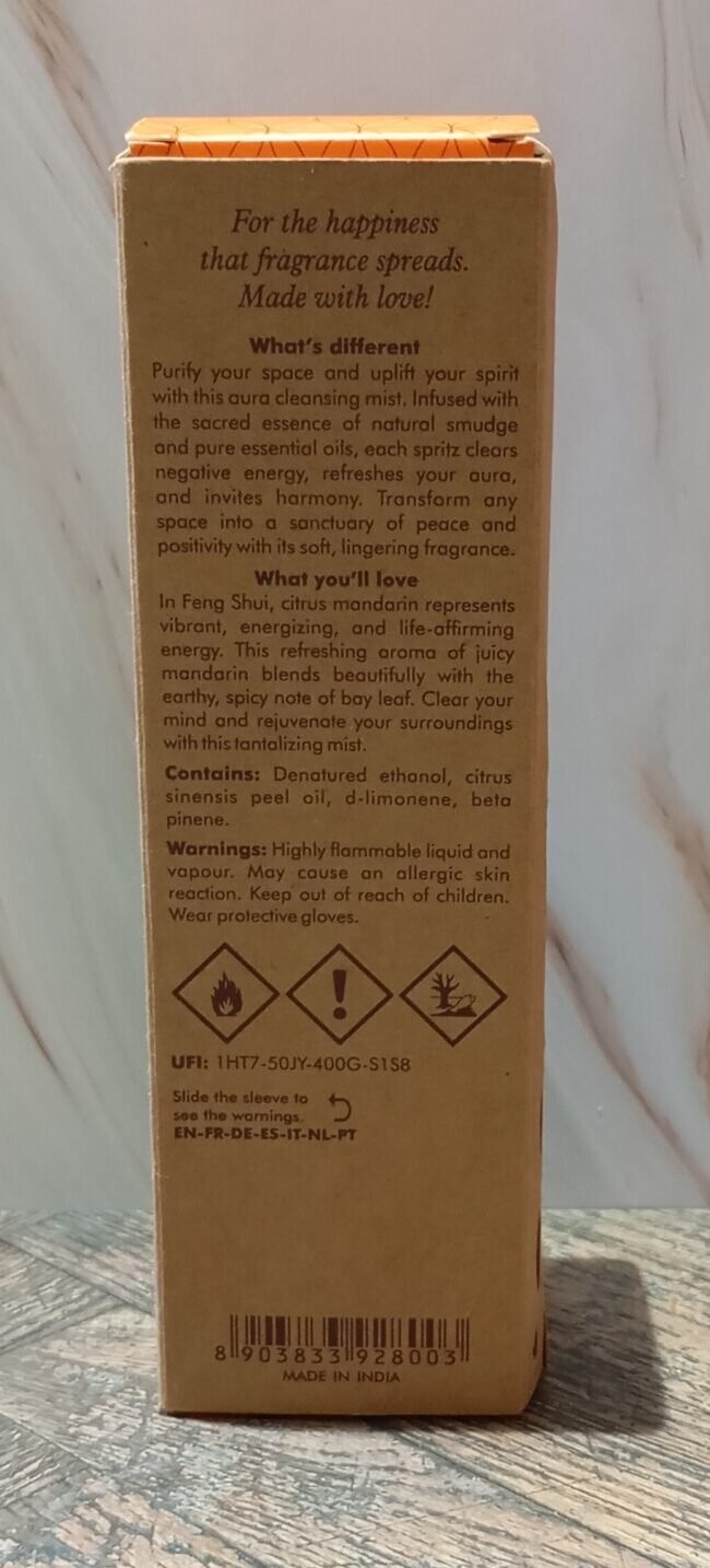 Purifiez votre espace et élevez votre esprit avec ce spray de purification. Infusée de l’essence sacrée d’encens naturel et d’huiles essentielles pures, chaque vaporisation dissipe les énergies négatives, rafraîchit votre aura et invite à l’harmonie. Transformez n’importe quel espace en un sanctuaire de paix et de positivité grâce à son parfum doux et persistant. En Feng Shui, la mandarine représente une énergie vibrante, dynamisante et porteuse de vie. Ce parfum rafraîchissant de mandarine juteuse se marie à merveille avec la note terreuse et épicée de la feuille de laurier. Clarifiez votre esprit et revitalisez votre environnement grâce à cette brume envoûtante.