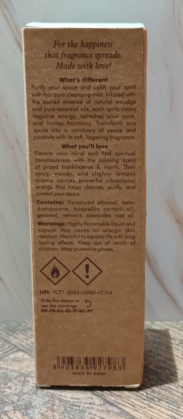 Purifiez votre espace et élevez votre esprit avec ce spray de purification. Infusée de l’essence sacrée d’encens naturel et d’huiles essentielles pures, chaque vaporisation dissipe les énergies négatives, rafraîchit votre aura et invite à l’harmonie. Transformez n’importe quel espace en un sanctuaire de paix et de positivité grâce à son parfum doux et apaisant du précieux oliban et de la myrrhe. Leur arôme épicé, boisé et légèrement citronné dégage une puissante énergie vibratoire qui aide à purifier, nettoyer et protéger votre espace.