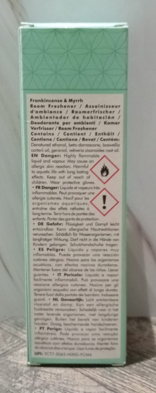 Contenance : 100 ml. Préparé avec des huiles essentielles et de l’alcool de canne à sucre biologique. Contient : Denatured ethanol, beta-damascone, boswellia carterii oil, geraniol, vetiveria zizanoides root oil. UFI : YCT7-5065-H00G-FCM4