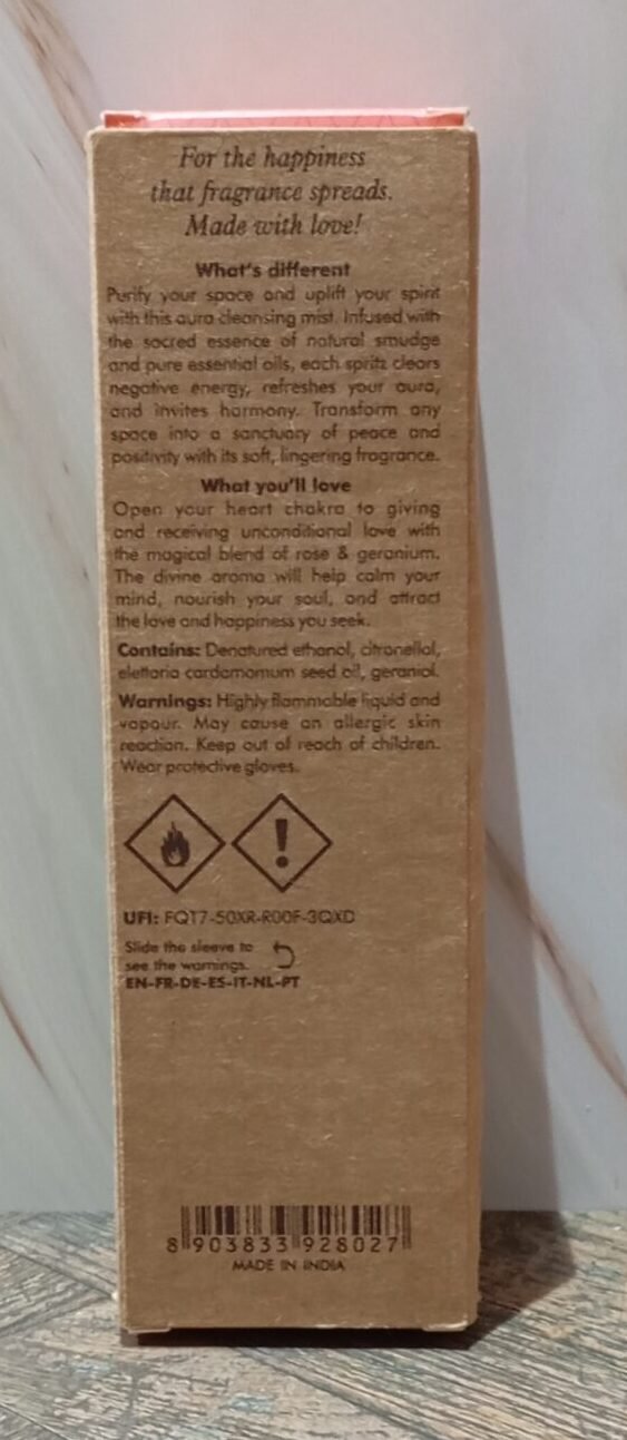 Purifiez votre espace et élevez votre esprit avec ce spray de purification. Infusée de l’essence sacrée d’encens naturel et d’huiles essentielles pures, chaque vaporisation dissipe les énergies négatives, rafraîchit votre aura et invite à l’harmonie. Transformez n’importe quel espace en un sanctuaire de paix et de positivité grâce à son parfum doux et persistant. Ouvrez votre chakra du coeur à l’amour inconditionel, tant dans le don que dans la réception, grâce au mélange magique de rose et de géranium. Son arôme divin aide à apaiser l’esprit, nourrir l’âme et attirer l’amour et le bonheur que vous recherchez.
